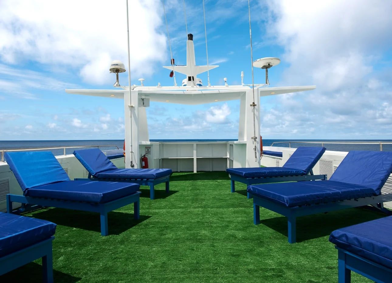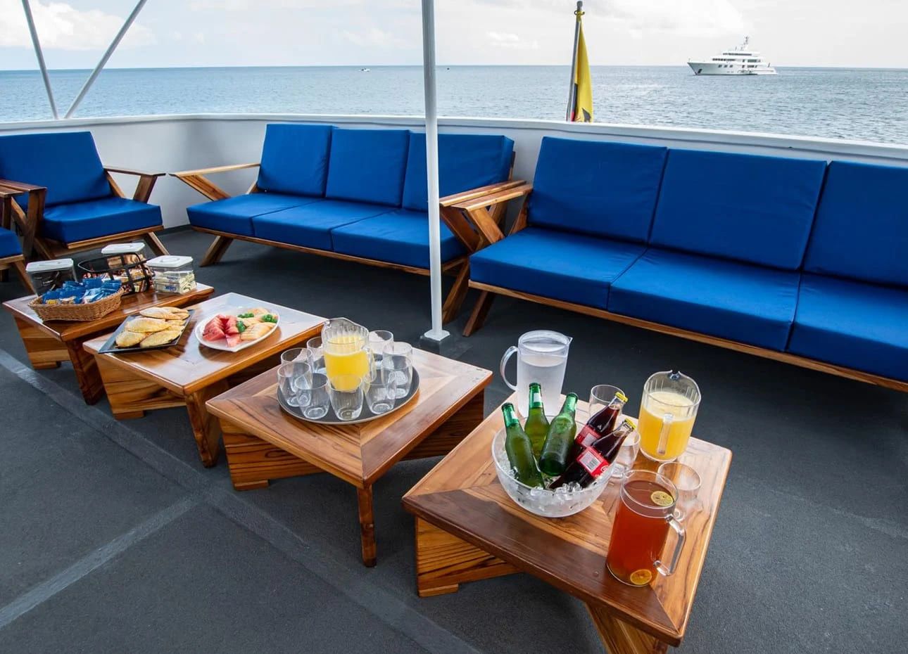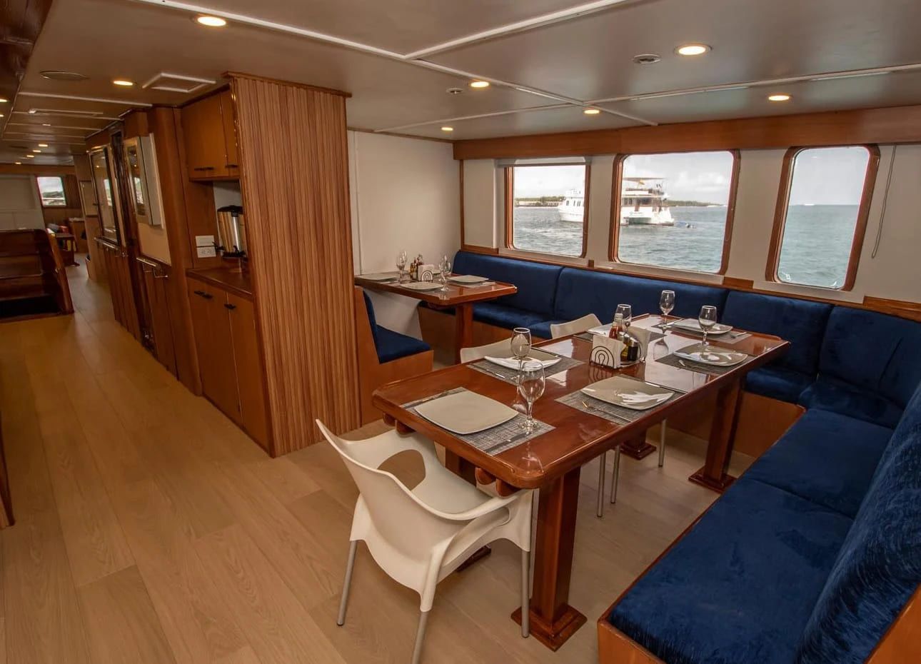 “加拉帕戈斯大师号”在当地被称为 Deep Blue,是一艘 32 米长的水肺潜水船宿游轮。八间空调客舱分布在三个甲板上,每间客舱均配有带热水的私人套间浴室以及充足的储藏室,可存放您的所有个人物品。 为了增加便利性和灵活性,加拉帕戈斯大师号提供了一些可用作双床间或双人床间的小屋。公共区域包括位于中间甲板的宽敞室内休息室,客人可以在等离子电视上观看自己喜爱的电影或最新的水下镜头,放松身心。“加拉帕格斯大师号”的顶级日光甲板确保阳光爱好者可以在欣赏加拉帕戈斯群岛美景的同时晒黑皮肤。 或者,对于那些喜欢在阳光下放松的人来说,阴凉的上层是在带软垫的躺椅和长凳上放松的理想场所。