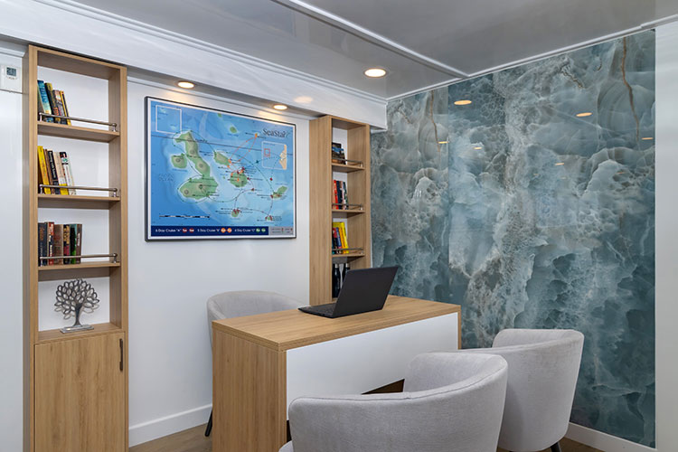 • 海星旅行套房位于上层甲板,如同您在加拉帕戈斯群岛上的私人公寓,配备一张特大号床。